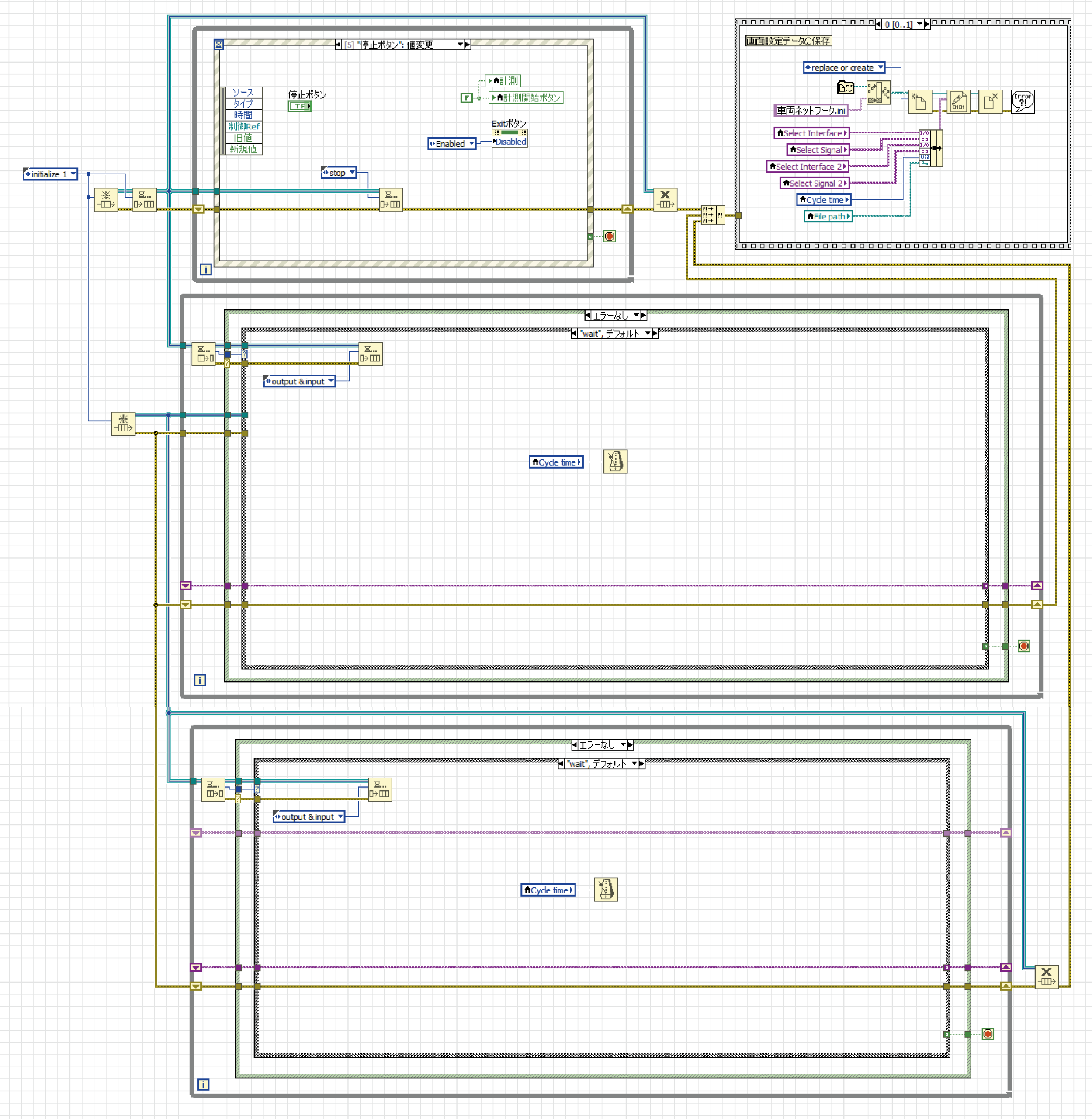 XNET Read関数を配置して(CAN受信)を実行する。CAN受信データをグラフとResult表に表示する。Cycle timeの待ち時間はwaitの処理で行う。