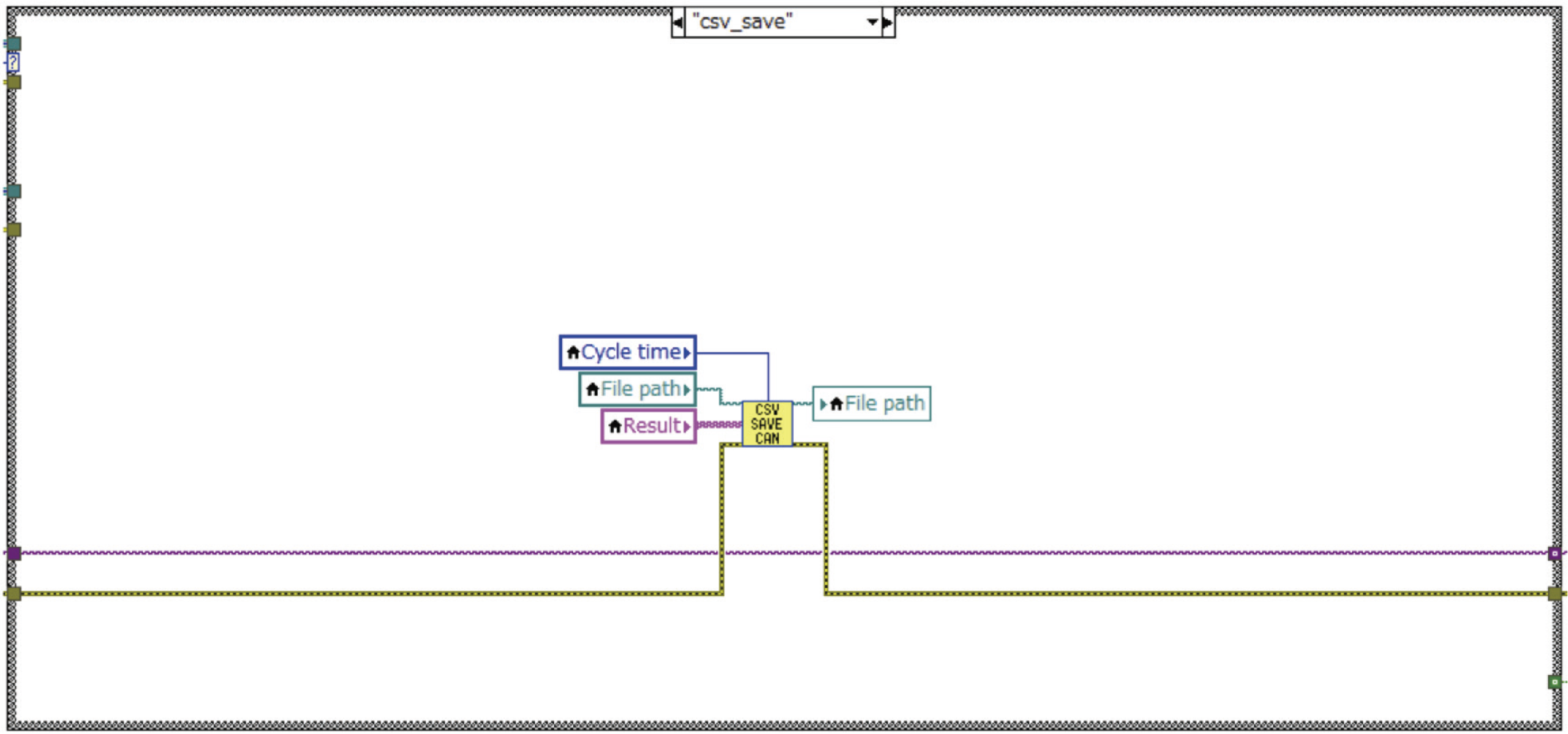 ファイルパス、計測結果(表形式)、およびcycle timeを入力パラメータとして、yyyymmdd_hhmmss.csvの名称でファイル保存を行うVIを作成する。