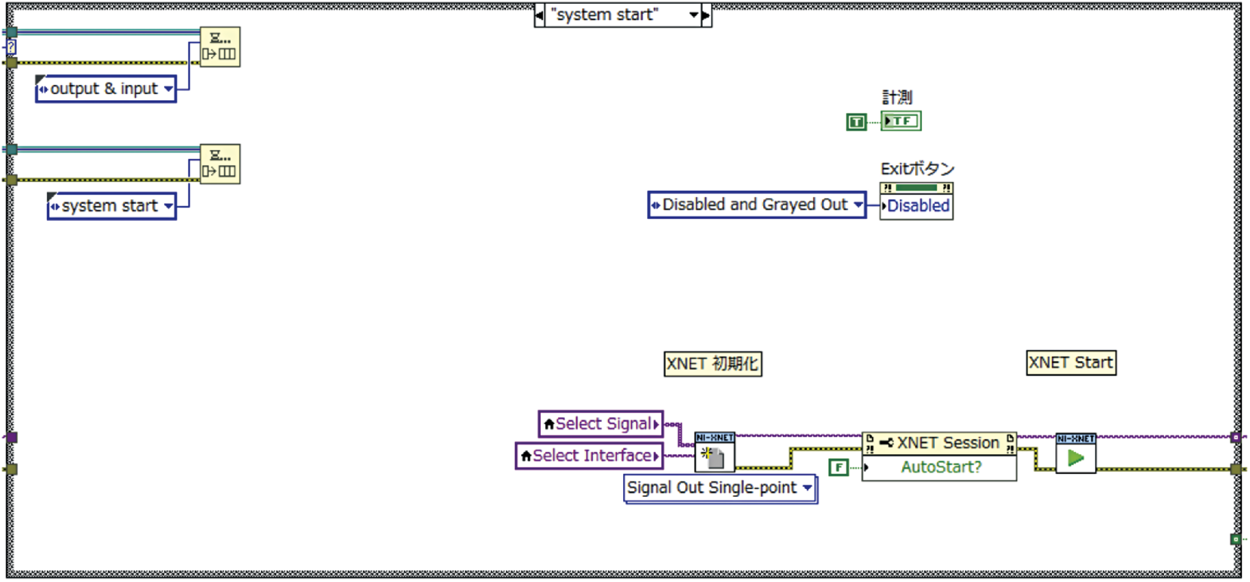 計測ランプ(ON)とExitボタン(Grayed Out)を実行し、XNET(CAN送信)の初期化と開始を実行する。