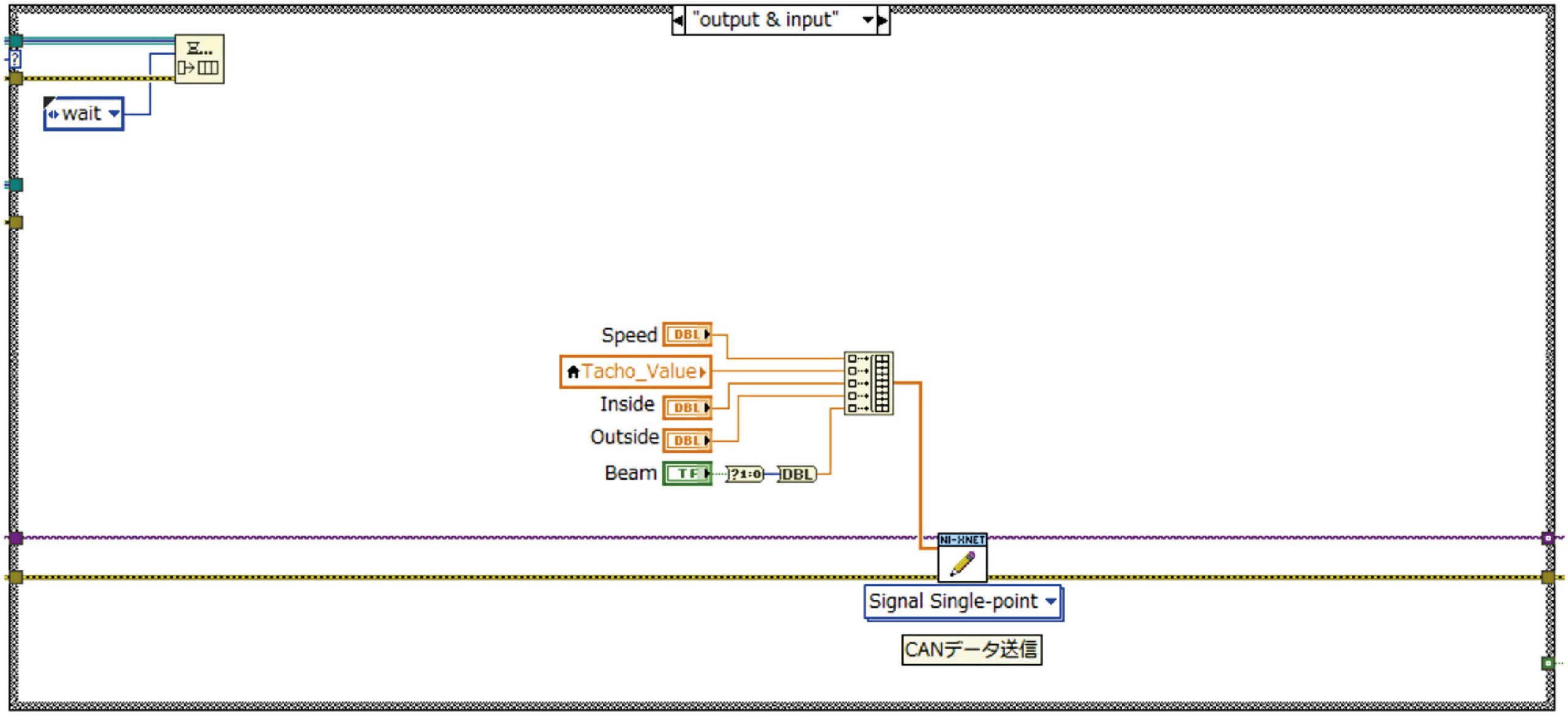 XNET Write関数を配置して(CAN送信)を実行する。Cycletimeの待ち時間はwaitの処理で行う。