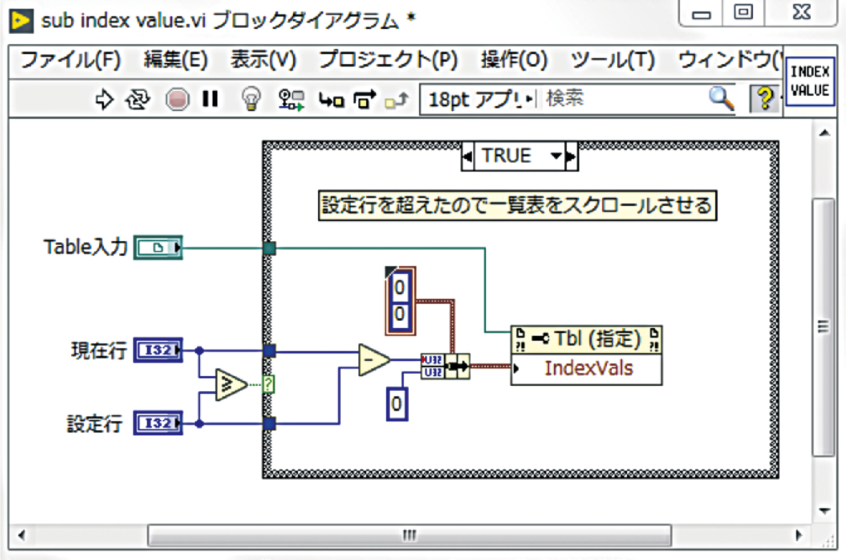 現在行、設定行、盛漁期refnumを入力パラメータとして、現在行が設定行を超えた場合に、一覧表を垂直方向にスクロールさせるサブVI。