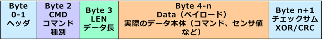 バイナリプロトコルでは通信データの「パケット(フレーム)」の構造を事前に定義します。 以下は典型的な設計例です。