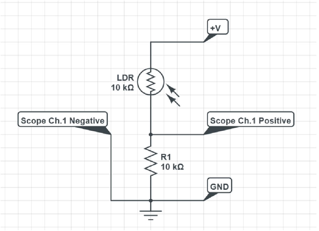 計測回路はシンプルな分圧回路構成をベースにしています。LDRは +5V 電源と計測ノードの間に接続され、固定抵抗 10 kΩ は計測ノードと GND の間に接続されます。中間点の出力電圧は光強度に応じて変化し、デバイスのオシロスコープで計測します。