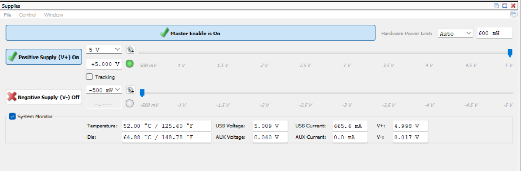 - WaveForms で Supplies(電源)計器を開きます。