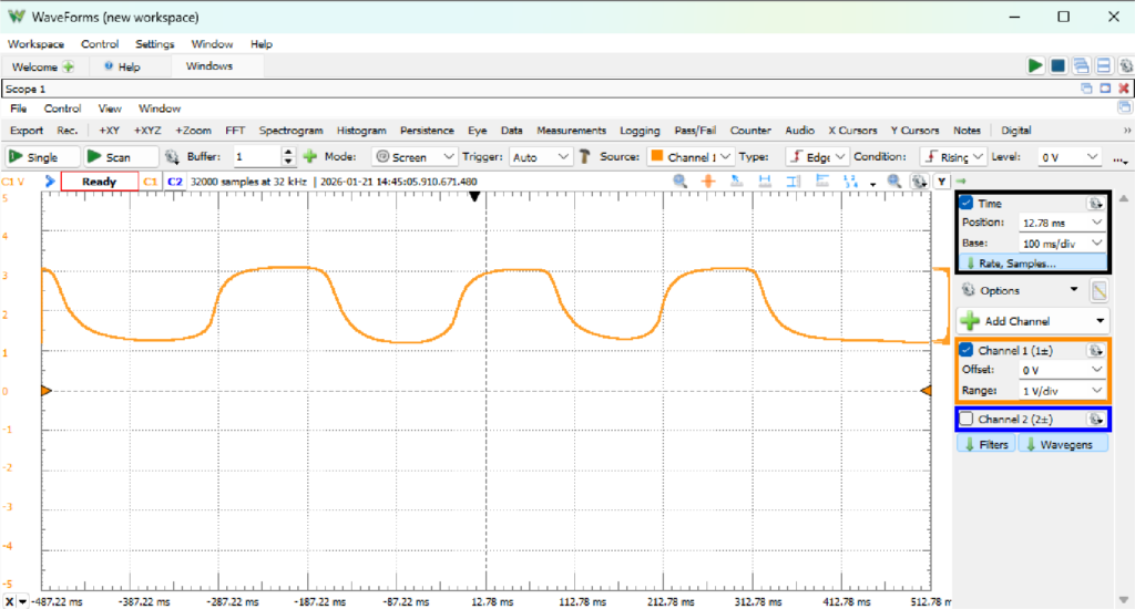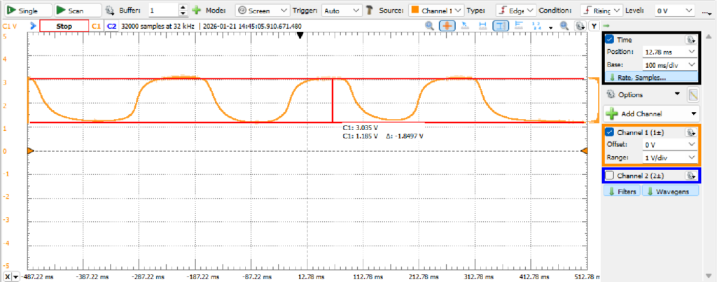 - Time Base を 100 ms/div に調整し、安定した電圧変化を観察できるようにします。