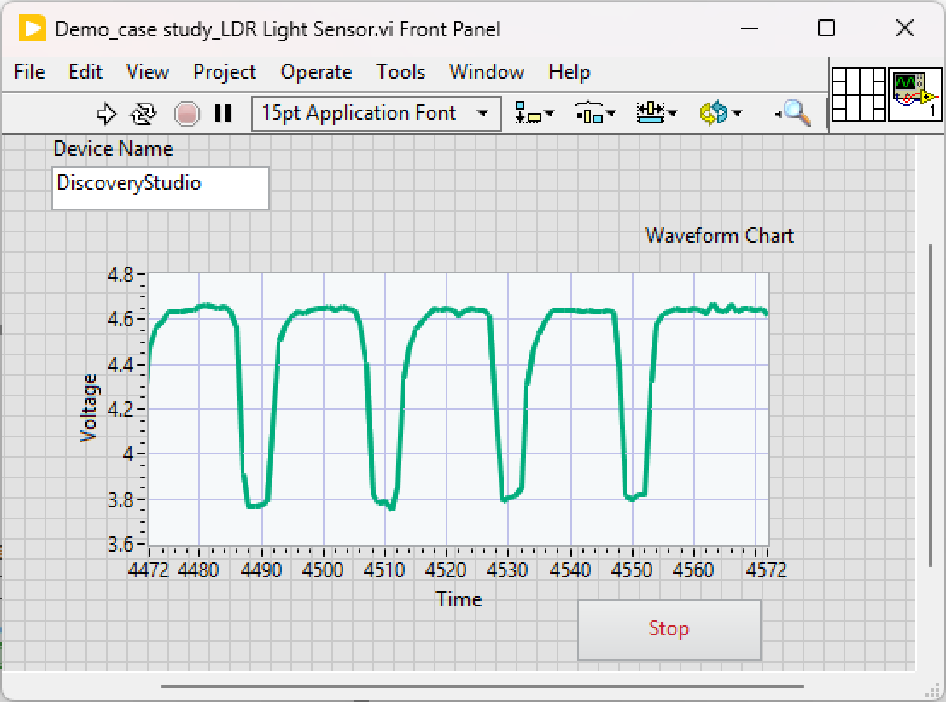 - 光強度を変化させ、Waveform Chart 上の変化を観察します。実験中は、手でセンサーを部分的に覆ったり露出させたりして LDR への入射光強度を手動で変化させ、照度変化が計測電圧に与える影響を直接観察してください。